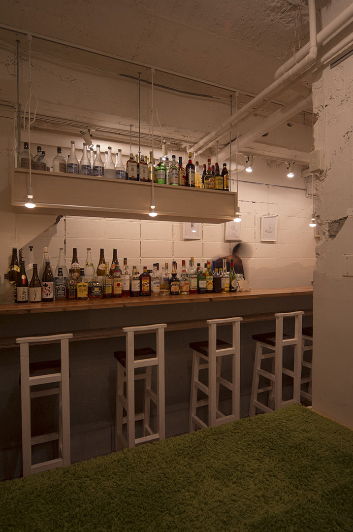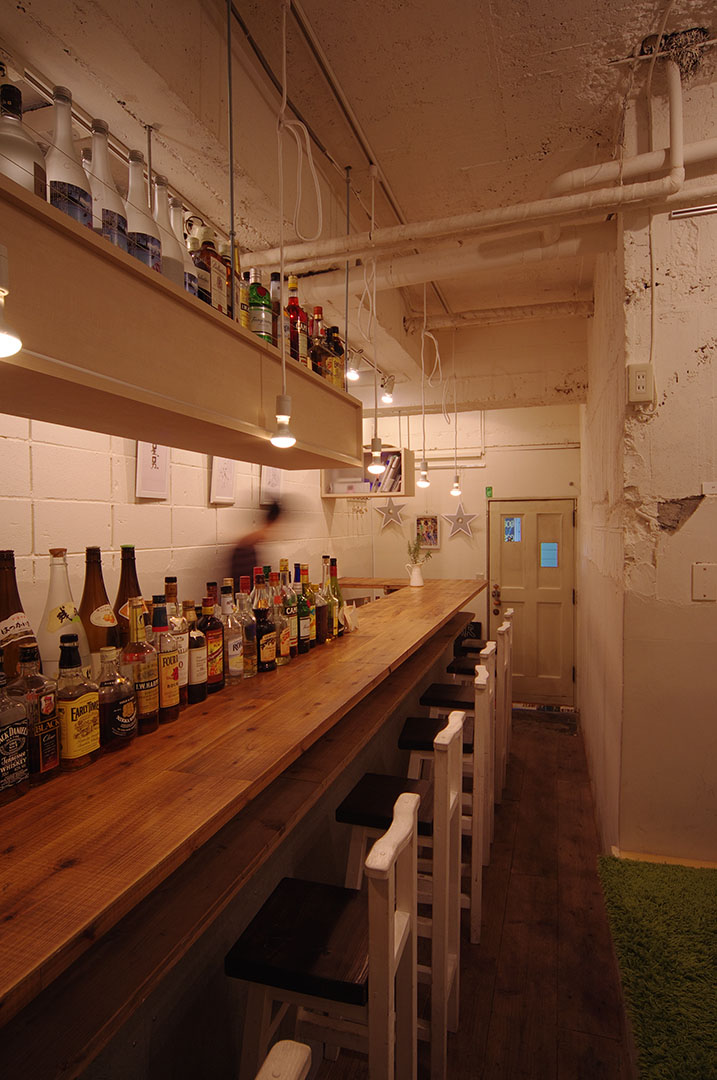 2mを切る狭い間口のテナントであったが、狭さを感じさせないよう天井を現わしとして高くとることで広がりを持たせた。また、奥には建物地下への階段の一部が「めり込んできている」という特殊な躯体形状を活かした「小上がり」を設けることでカウンターと対照的に複数人がくつろげる場を作り、かつ収納スペースも確保している。