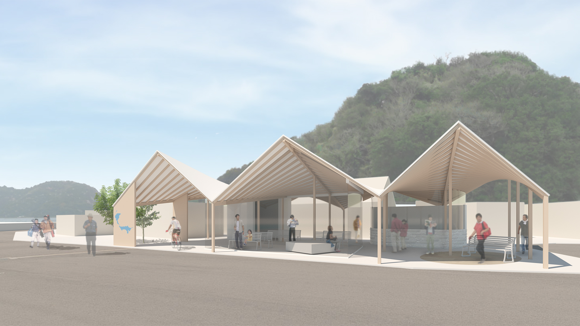 部材は直線材でありながら屋根にはおおらか曲線形状が現れ、島並みや波のラインをイメージさせる象徴的な意匠を持たせた計画とした。