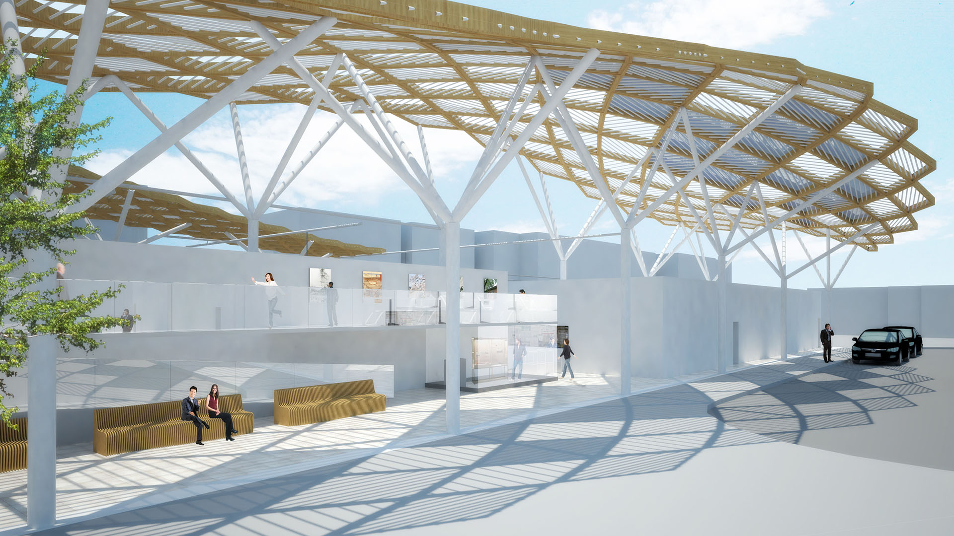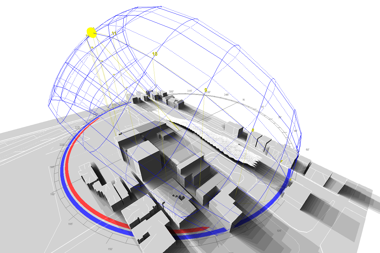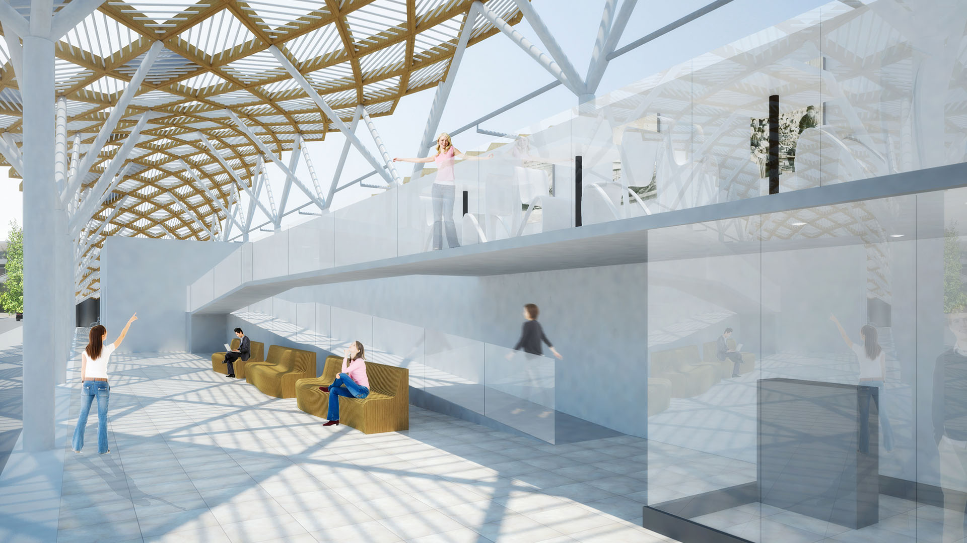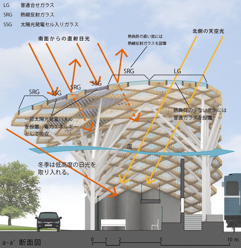 複数のユニットパネルから成る駅施設全体を覆う大屋根を提案。それぞれのユニットへの日射取得量を解析し、それに応じて数種の機能性ガラスを使い分け、機能的にも意匠的にも象徴性のある駅舎施設となることを意図している